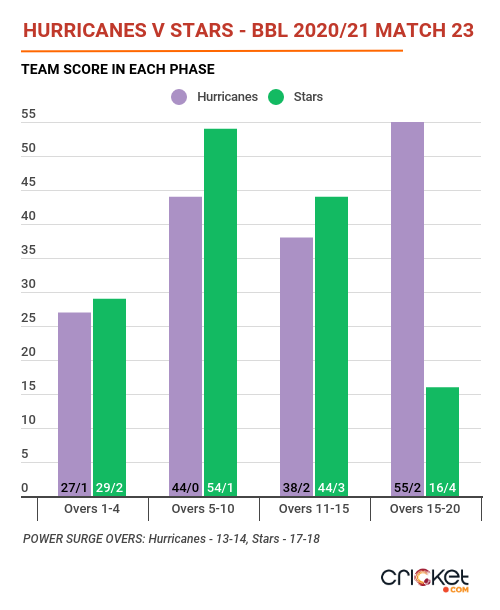 As it has happened many times before this season, the two-over power surge ends up benefitting the bowling side, instead of the batting team. Today was no different as the Hurricanes batting first managed just five runs in two overs, whereas the Stars could muster up just 10. While the Hurricanes could have easily gone past the 175-run mark, the Stars could have tilted the game in their favour had they played sensibly and perhaps scored 10-15 runs more in those two overs. Unfortunately, both teams failed to utilize it, but in the end, it hurt the Stars more than it did the Hurricanes.