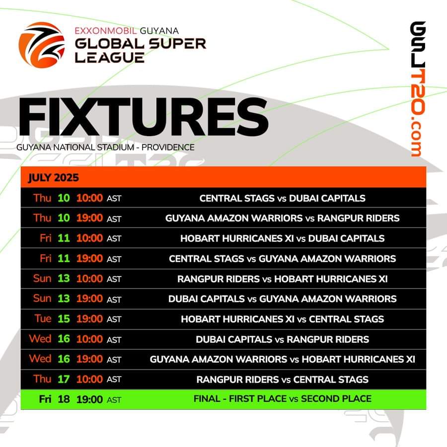 यहाँ ग्लोबल सुपर लीग 2025 का पूरा कार्यक्रम दिया गया है: