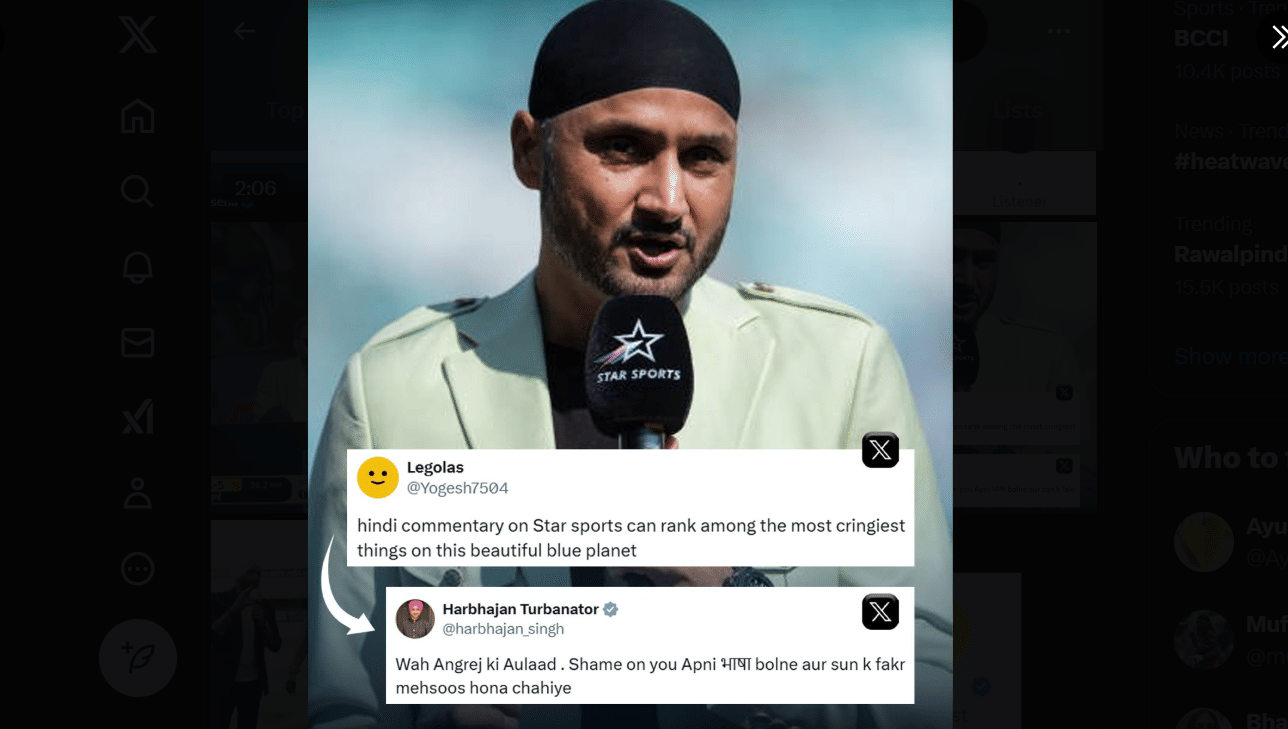 दरअसल, सोशल मीडिया पर एक भारतीय प्रशंसक ने हिंदी क्रिकेट कमेंट्री को धरती पर "सबसे शर्मनाक चीजों" में से एक बताया। प्रशंसक की पोस्ट पर प्रतिक्रिया देते हुए हरभजन सिंह ने उसे डांटा और उसको अपनी भाषा के बारे में ऐसे बोलने पर शर्म करने की नसीहत दी।