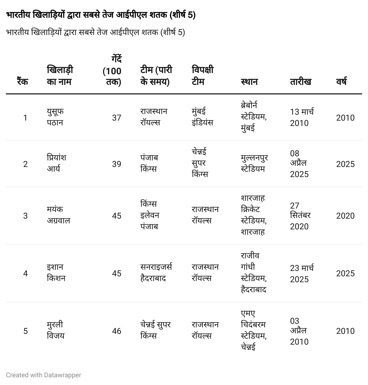 हाल में युवा बल्लेबाज प्रियांश आर्या ने पंजाब किंग्स के लिए खेलते हुए चेन्नई सुपर किंग्स के खिलाफ 39 गेंदों मं शतक ठोक कर IPL में सबसे तेज शतक बनाने वाले भारतीय खिलाड़ियों की सूची में शामिल हो गए।