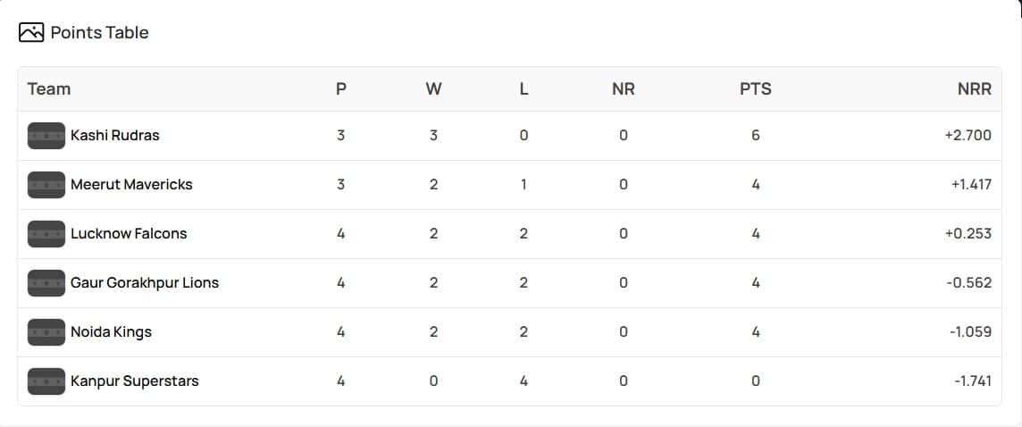 UP T20 2025, Match 13: Gaur Gorakhpur Lions vs Kanpur Superstras - यूपी टी20 लीग 2025 प्वाइंट्स टेबल