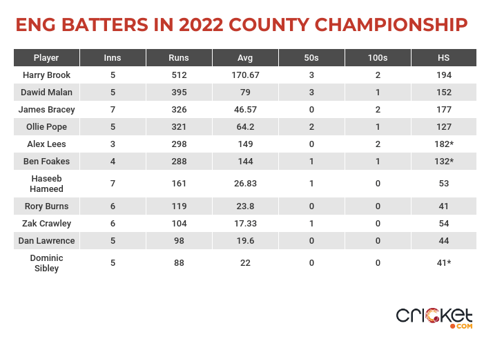 It's so far been a season to remember for young Harry Brook, who is knocking on the door by putting up some irresistible numbers. Pope, Malan, Foakes, Bracey and Alex Lees have all also fared well, but it's been a struggle for the likes of Crawley, Sibley, Burns and Lawrence.
