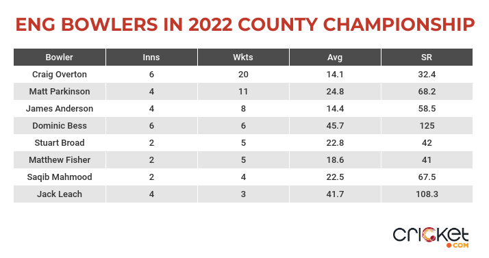 For someone who has been the best spinner in England for the past half-a-decade, Simon Harmer has made an uncharacteristically fruitless start to the 2022 season. In 5 innings the off-spinner has managed to pick just 4 wickets, and he’s gone wicketless on three separate occasions. Harmer, however, has made handy contributions with the bat in hand, averaging 28.25. His 75* in the second innings helped Essex avoid an innings defeat against Warwickshire.