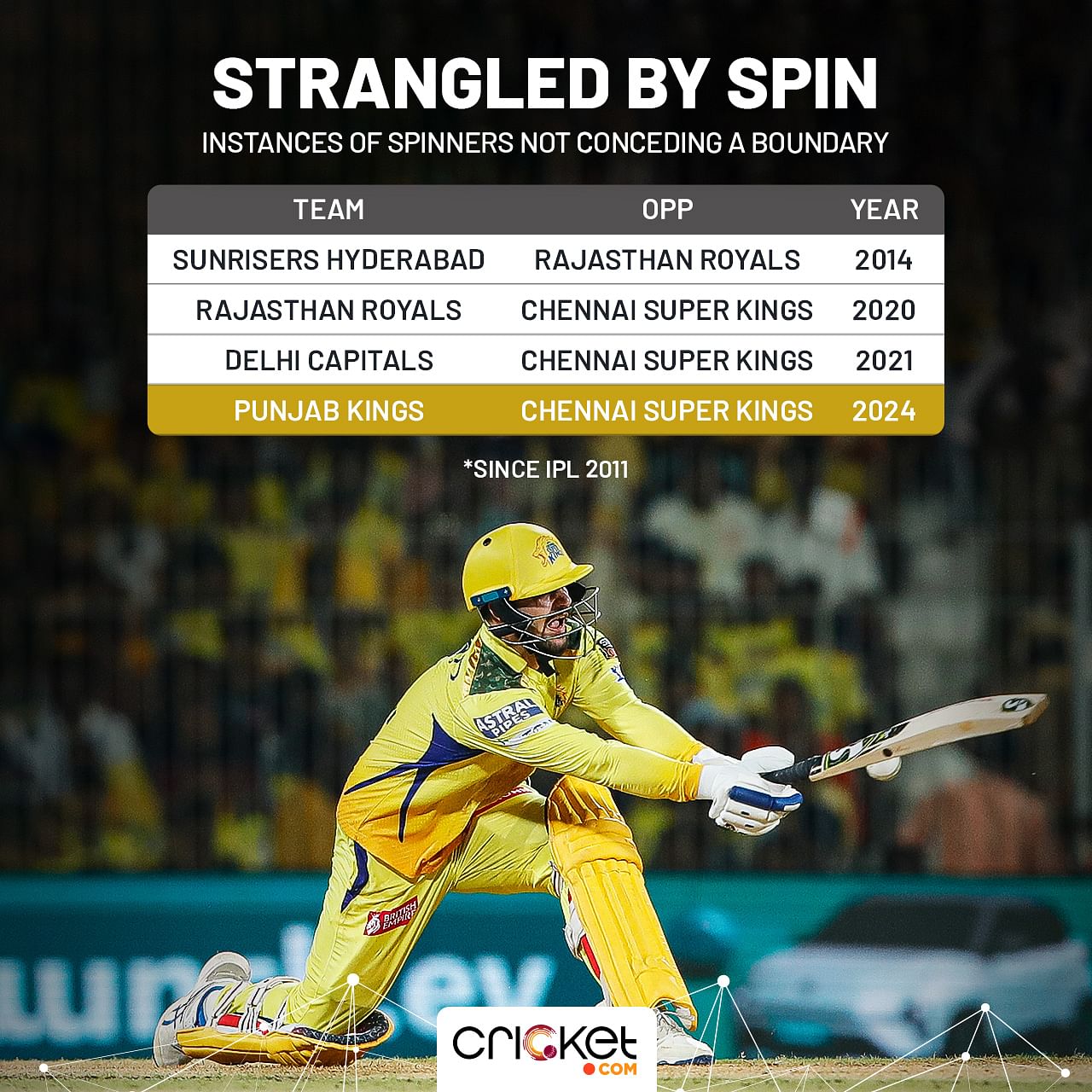 After CSK got off to a good start in the powerplay, Punjab Kings (PBKS) spinners Harpreet Brar (2/17) and Rahul Chahar (2/16) completely choked the opposition batters, not conceding a single boundary between them – a rarity in the Indian Premier League (IPL).