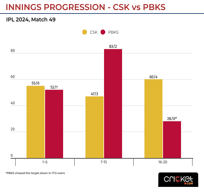 With the spinners' stronghold post the powerplay, CSK could manage just 47/3 in the middle-overs, which ensured that they lost all the momentum and turned the game in PBKS’ favour.