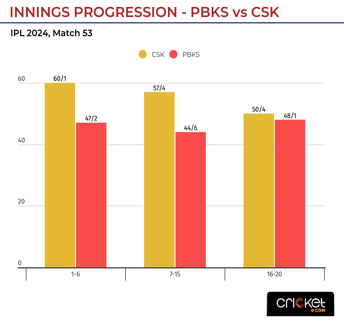 PBKS lost as many as six wickets, scoring just 44 runs in the middle overs (7-15), effectively playing themselves out of any chance of reaching the target. Ravindra Jadeja was the pick of the bowlers in the phase, finishing with 3/20, controlling the phase.