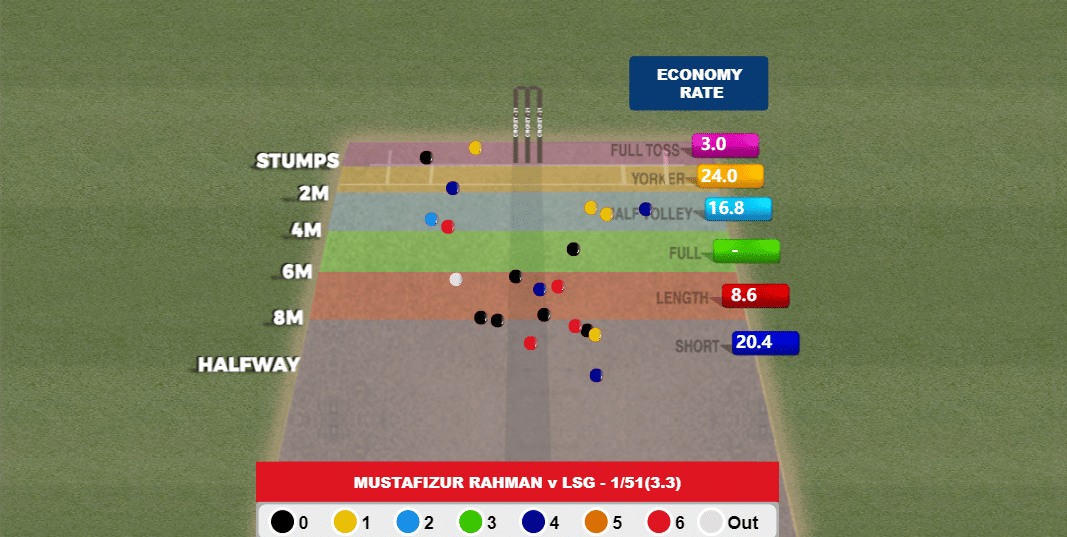 With dew playing a huge role, Mustafizur struggled to bowl the yorkers, resulting in way too many half-volleys (5), conceding runs at 16.8 in that length. It was way too short whenever he bowled short, with an economy of 20.4.