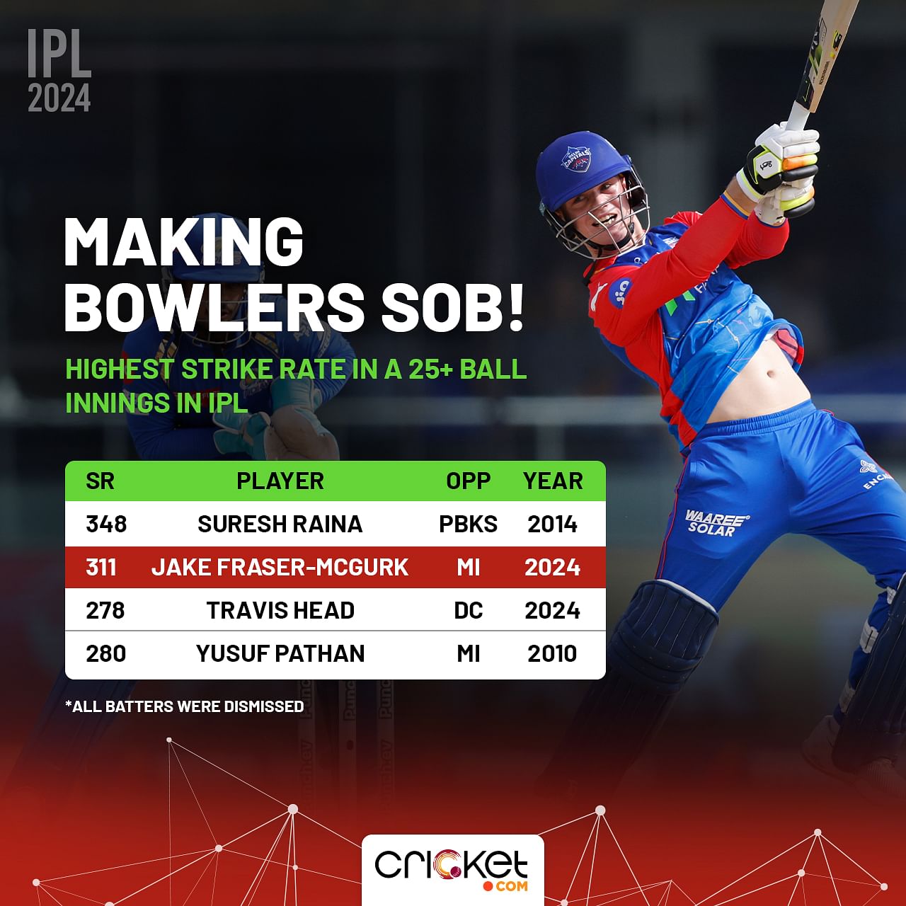 It was just another day at work for Jake Fraser-McGurk. The 22-year-old from Australia smashed 78 off 24 in the powerplay, the third-most by any batter in the IPL. He showed no mercy whatsoever, even hitting Jasprit Bumrah for 18 runs in an over. JFM eventually got out for 84 off 27.