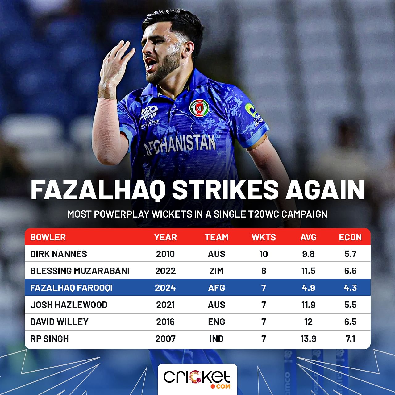 Farooqi, who is currently the leading wicket-taker in the competition, now has seven wickets in the powerplay at an average of 4.9 - the best for any bowler with at least six wickets in the powerplay in a single T20WC campaign.