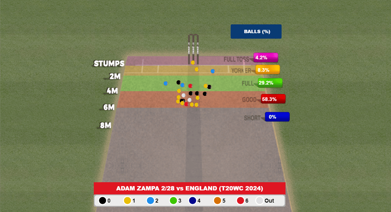 Over the next four overs, Zampa used the longer boundary to his use, with figures of 2/28, removing both Buttler and Salt, bowling 58.3% of his deliveries in a good length area. That spell reduced England from 73/0 to 92/2, dooming further trouble.