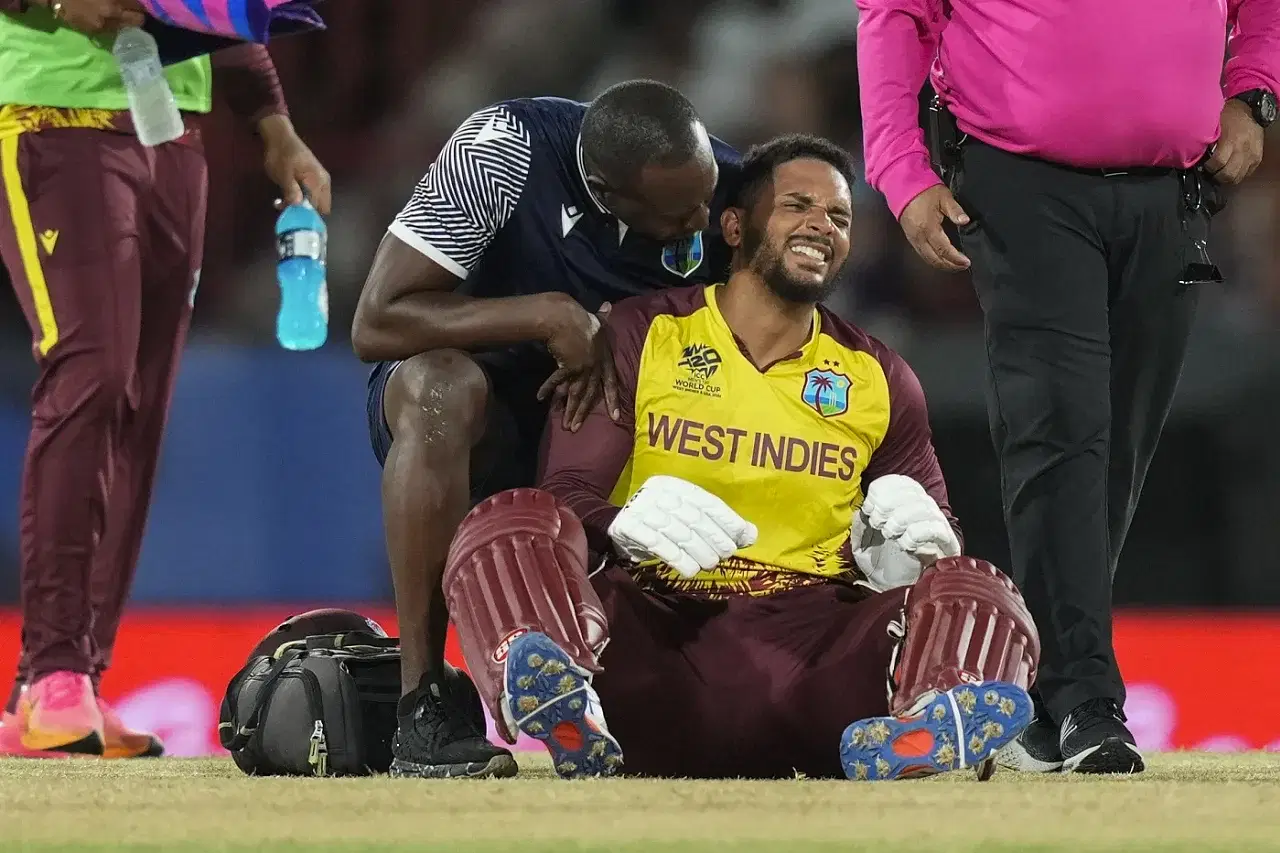 Brandon King provided the hosts the perfect start in the Super 8 clash, racing to 23 off just 12 balls. But just when he seemed to be in the right space, after three fours and a six, he had to walk off the pitch with a groin injury.