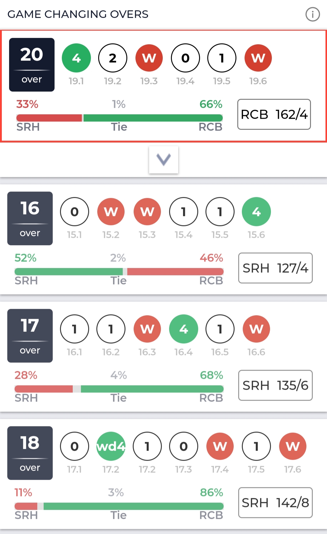 They came back again along with Dube to deliver 4 overs of high impact (Overs 16 to 19), where RCB made deep inroads and SRH set the self-destruct button on. 25/7 in 24 balls, resulted in a win% impact swinging from 22 to 98.