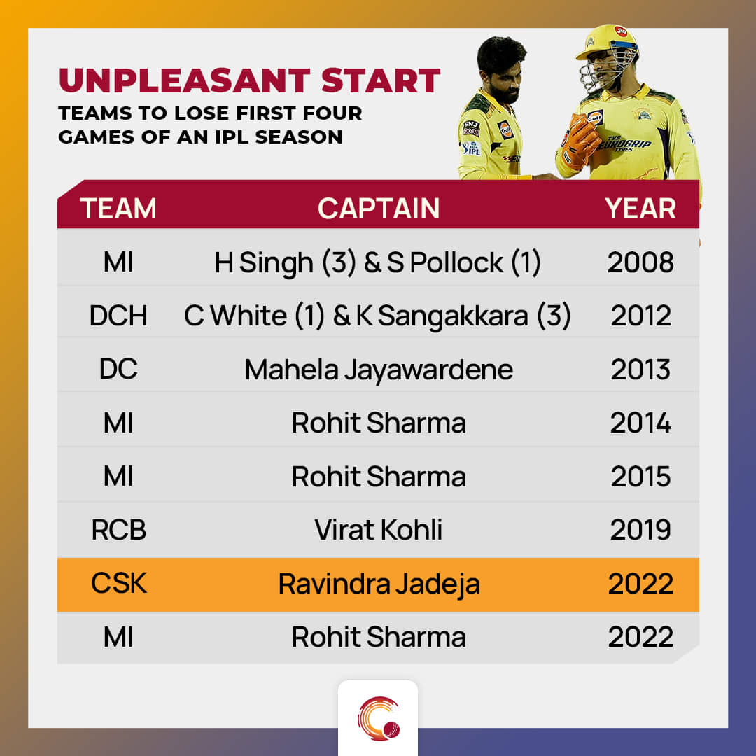 In the IPL, they became the fourth team after the now-defunct Deccan Chargers in 2012, Delhi Capitals (Daredevils then) in 2013, Bangalore in 2019 and Mumbai in 2008 (4), 2014 (5), 2015 (4) and 2022 (4) to lose first four matches of an IPL season. Ravindra Jadeja has been the captain in all the four losses. He became the second captain after Aaron Finch in 2013 for the now-defunct Pune Warriors India, to lose all first four matches.