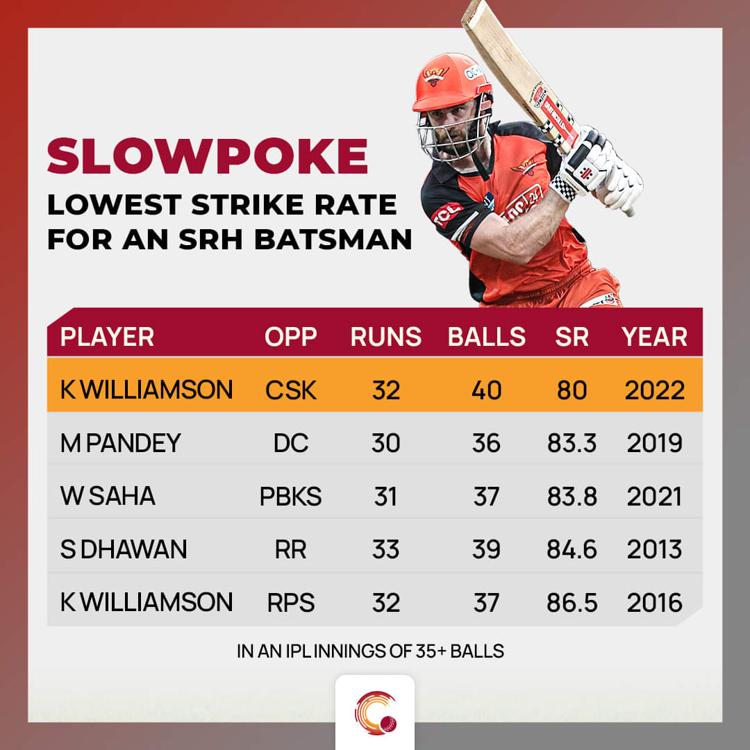In the end, Williamson was dismissed after playing 40 balls and there was no acceleration from his end. Among Hyderabad batters who have faced 35+ balls in an IPL innings, his strike rate of 80 is the lowest.
