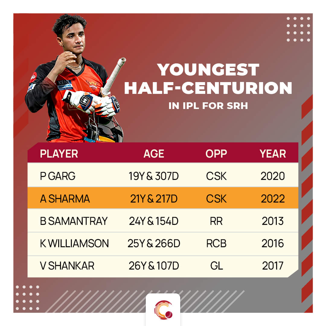 With Williamson struggling to score runs at one end, Abhishek took the initiative and went after the bowlers and registered a fifty of 32 balls. At the age of 21 years and 217 days, he became the second youngest Hyderabad batsman to hit a half-century in the IPL.
