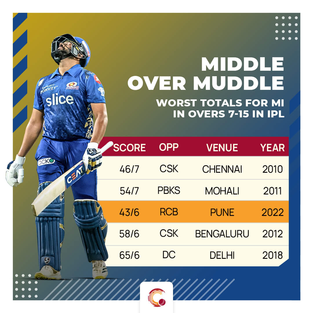 From 50/0 at 6.1 overs, Mumbai slumped to 6/80 at the end of 14 overs. After scoring 49/0 in the first six, Mumbai scored only 43 runs in the middle overs (7-15) and lost six wickets. In the IPL, only twice have they had a worse total than 43/6 in this phase. But, while batting first, this is the first time they have lost six wickets in overs between 7-15.