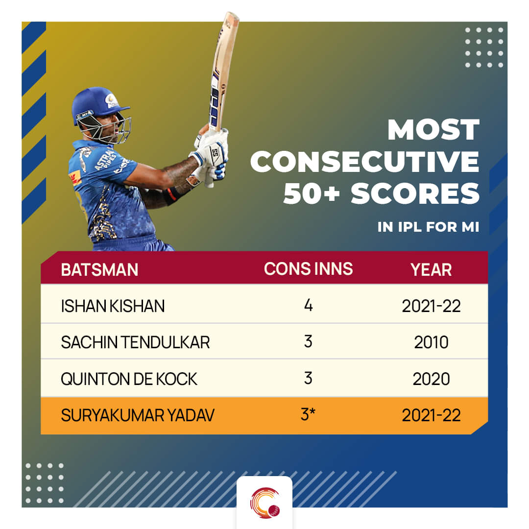 Despite wickets falling at one end, Suryakumar was aggressive and smashed a half-century in 32 balls and registered his third successive 50+ score from Mumbai. He became the fourth Mumbai batsman in the IPL after Ishan Kishan, Sachin Tendulkar and Quinton de Kock, to hit three or more 50+ scores in succession. However, all his efforts were in vain.