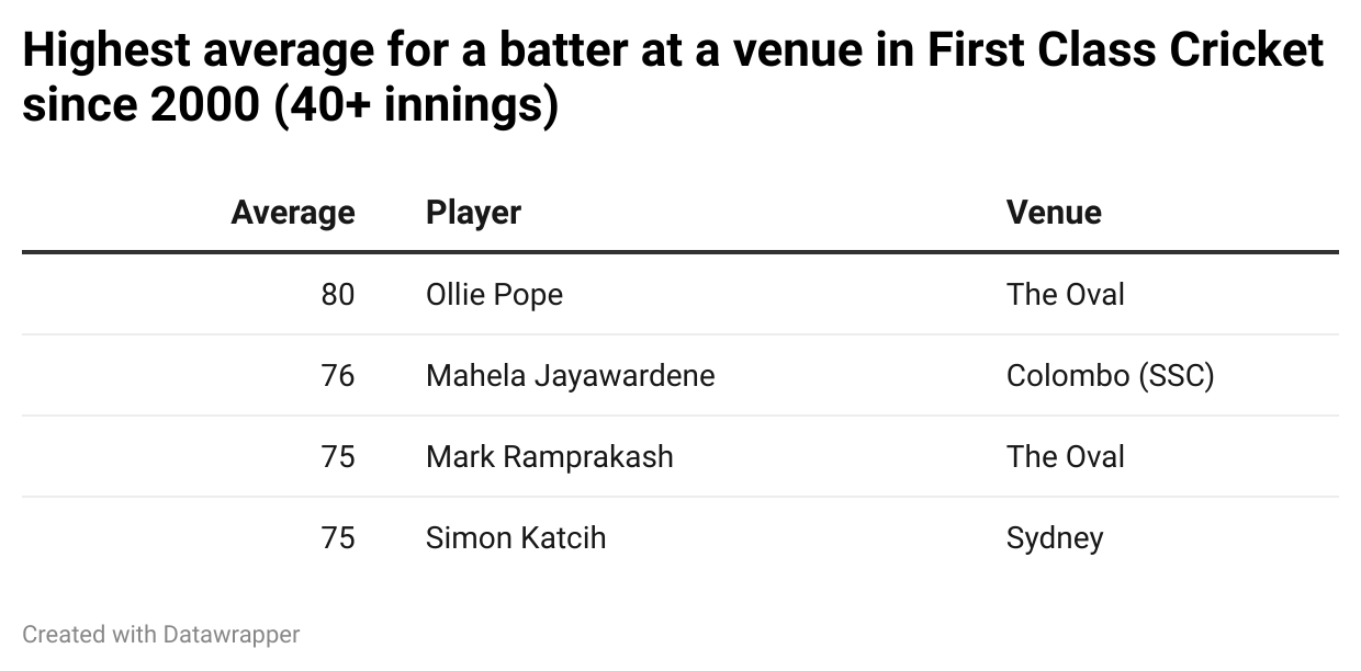 Pope, who plays for Surrey in the County Championships, has a first-class average of over 80 at the Oval, his home ground. At the start of the match, his average was 80, which is the highest for any batter at one ground since 2000 in more than 40 first-class innings.