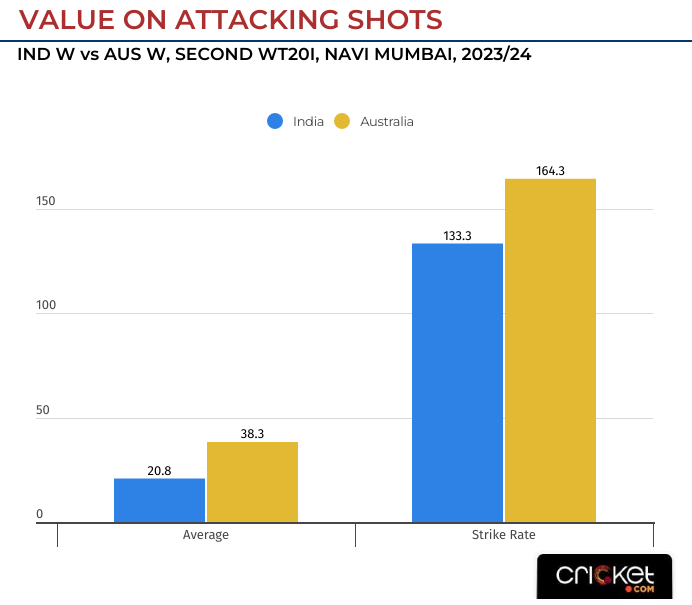India scored 104/4 on the 78 deliveries they played an attacking stroke. In response, Australia churned out a lot more value on their attacking shots - 115/3 in 69 deliveries. Both team played exactly the same proportion of dot balls - 50.8%.