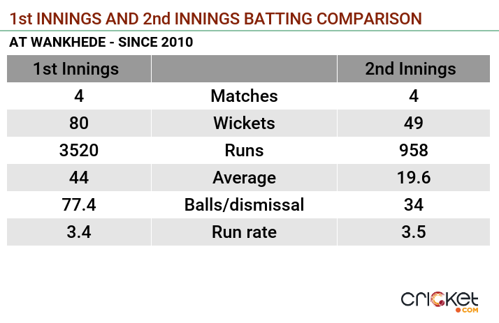 However, the numbers are polar opposites when it comes to batting in the second innings (3rd and 4th innings) at Wankhede in this time frame. Teams have lost a wicket every 19.6 runs in the second innings at Wankhede, which is the lowest among all the venues which have witnessed at least three matches. The highest second innings score has been 242. The average score in the second innings drops to 157 as compared to 440 in the first innings.