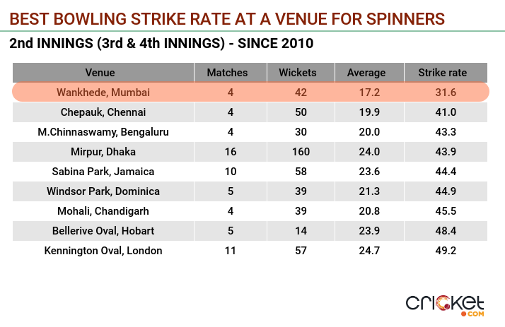 Among venues that have witnessed three or more matches, the strike rate and average of spinners at Wankhede are the best. In no other venue does the strike rate reduce to less than 40. In comparison, the spinners have picked up a wicket every 67.5 balls and 35.7 runs in the first innings.