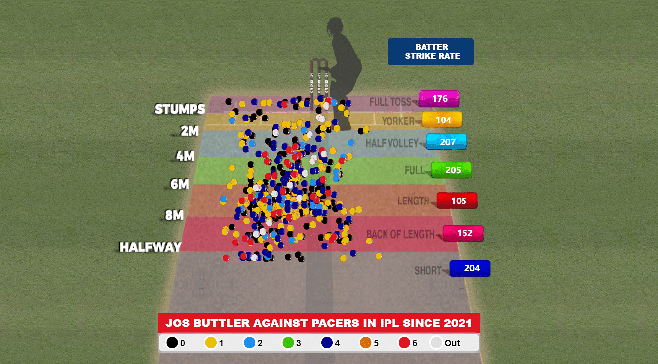 - In the IPL since 2021, Jos Buttler has 1117 runs at an average of 50.8 and a strike rate of 149.9. Only KL Rahul (1242) has scored more than him. Batting against the pacers, Buttler averages 46.6 and strikes at 146.1. Apart from good-length balls, he has a strike rate of 150 or above on all lengths. All-in-all, the pacers must pay attention to their lengths.