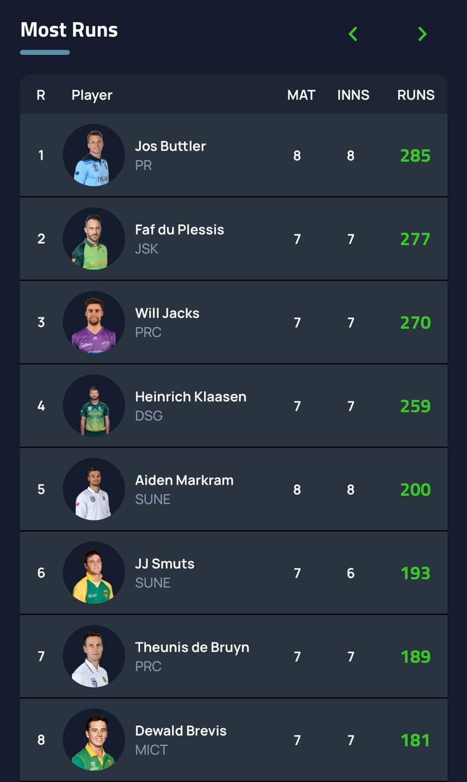 Will Jacks signs off in style Will Jacks lit up the first week of the tournament, and he signed off in style by smashing 56 (25) against DSG and 62 (27) against MI Cape Town. He had a rare failure with the bat against Paarl Royals (4) but even there he ensured to contribute with the ball by picking 2/7, taking the huge wicket of Jos Buttler.