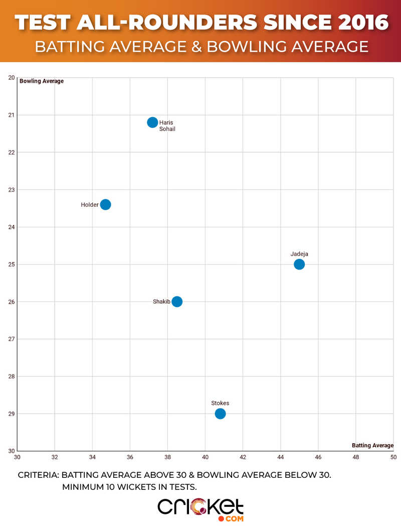 In the world of left-arm spinners as all-rounders, Stokes and Jason Holder carry the old legacy forward. With the ball, Holder has an exceptional record since 2018. His 53 wickets were at 14.2 runs per wicket, best among any bowler with more than 10 wickets in this period. His average only improved to 11.5 in two Tests away from home. This too on dry wickets in the subcontinent against India and Afghanistan.