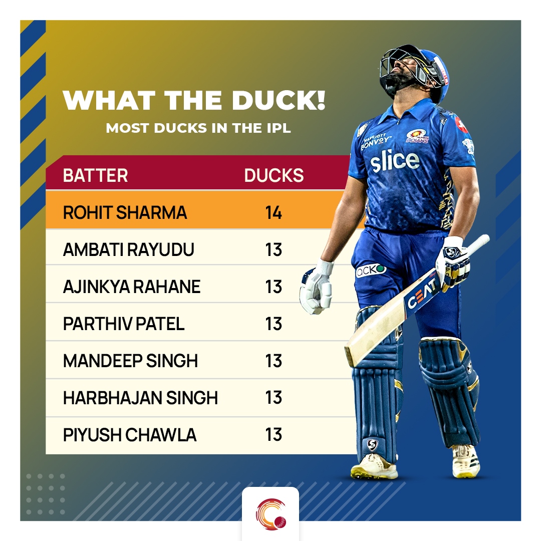 However, the right-handed batter was dismissed for a two-ball duck, making it the 14th instance of him being out without troubling the scorers, which is the most number of ducks in the tournament. Ajinkya Rahane and Ambati Rayudu are also part of this list of players who have 13 ducks.