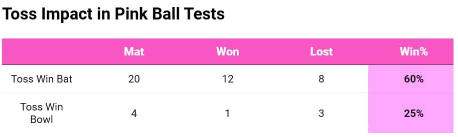 Toss has played a crucial role in D/N Tests as teams who have chosen to bat first have won 12 of the 20 games compared to teams who have chosen to field. Only once has a team has managed to win after opting to field first, with New Zealand thrashing England by an innings in Auckland in 2018.