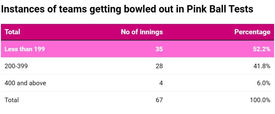 Batters have had a tough job adapting to the colour of the pink ball and its behaviour. This has resulted in an increase in low scores, as 52.2% of all outs in pink ball Tests have been under 200.