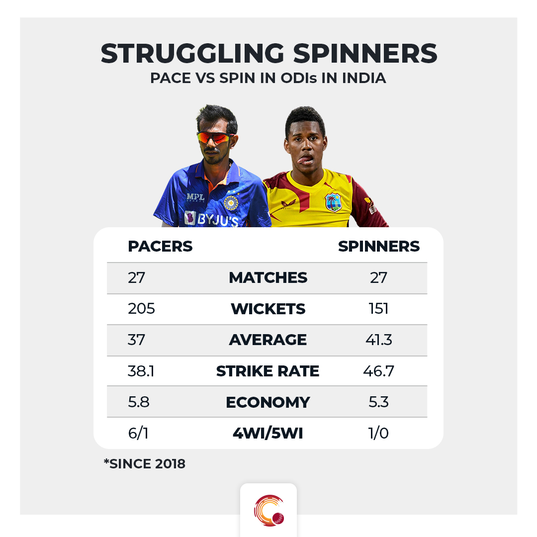 However, in ODIs in India since 2018, the pacers have been way better than the spinners. The differences before weren’t alarming as compared to this four-year span. In the mentioned time frame, pacers have bagged a wicket every 37 runs and 38.1 balls with seven four-wicket hauls, including a five-for. Whereas, the spinners have picked up a wicket every 41.3 runs and 46.7 balls with just one four-wicket haul.