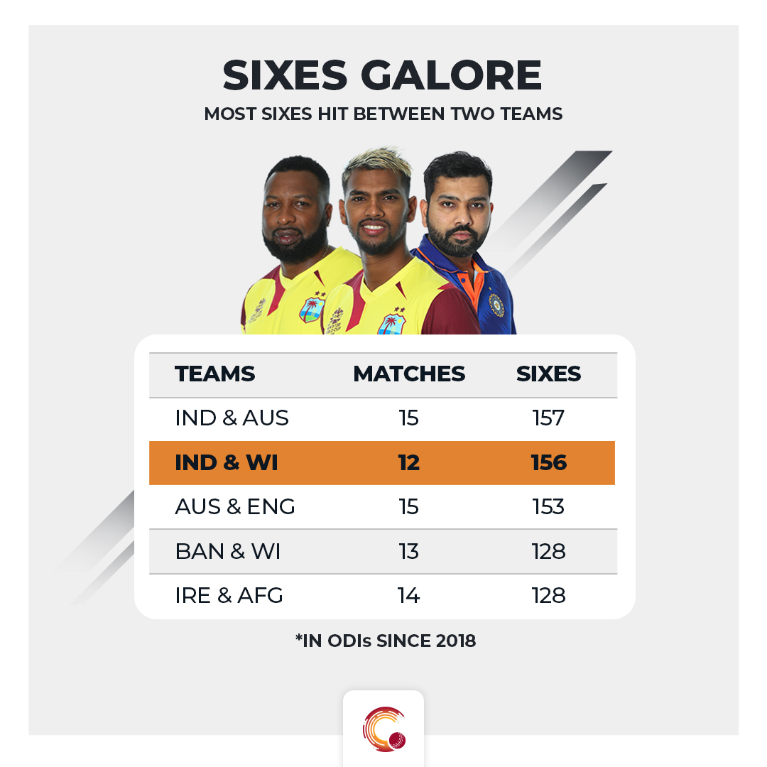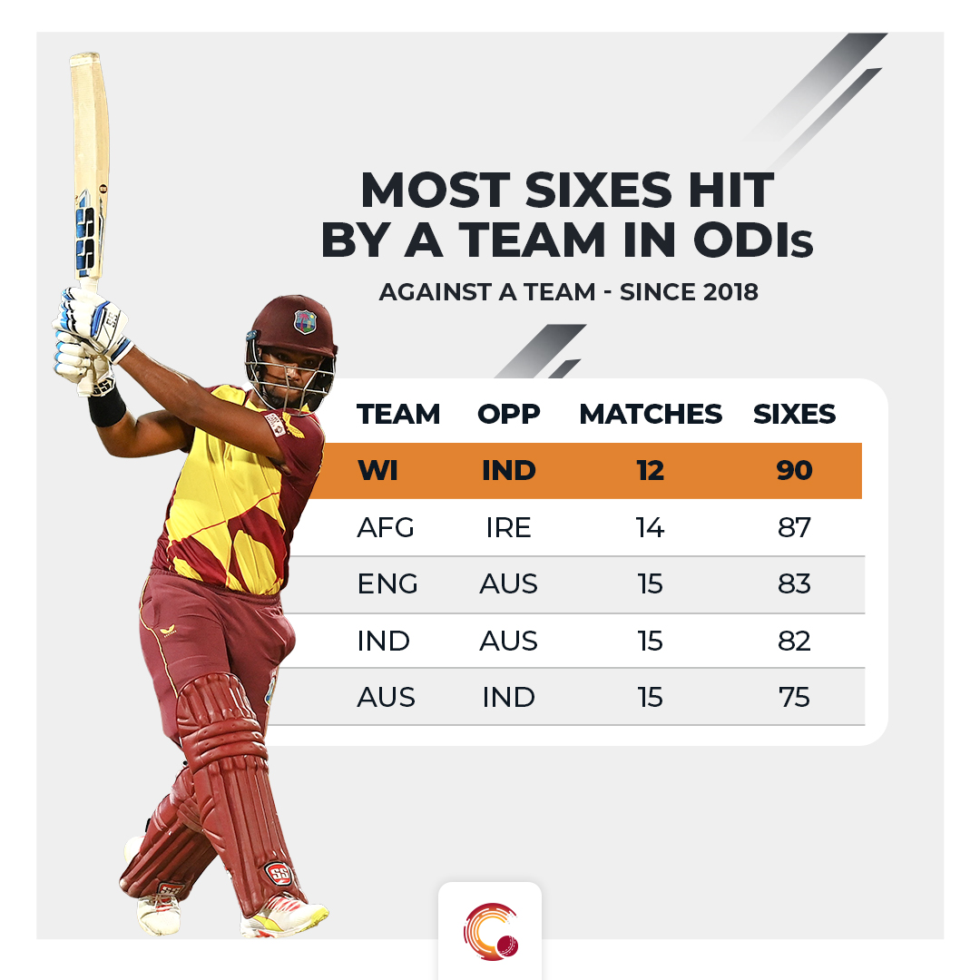 Indian batsmen have hit 66 sixes against West Indies in 12 matches, their second-most against a team in ODIs since 2018. Whereas, West Indies batsmen have hit 90 sixes, which is the most against a team for them in this time frame. The 90 sixes hit by West Indies in this period is also the most by a team against an opposition.