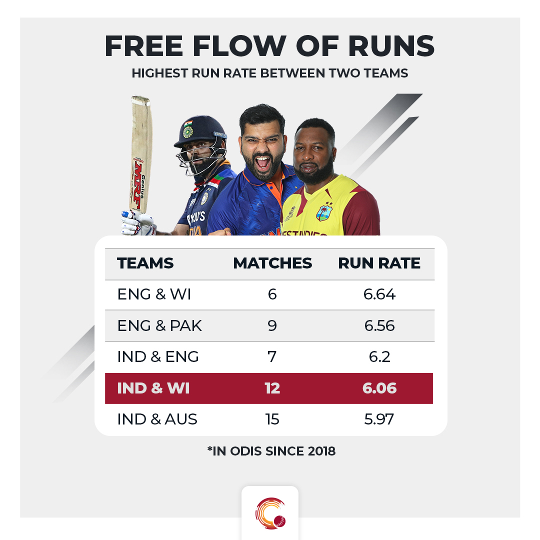 As for India, in the aforementioned time, they have scored at a run rate of 6.5 against the West Indies in ODIs, which is their best against a team. They have had five scores of over 300 in 11 innings they have batted (one innings was washed out).