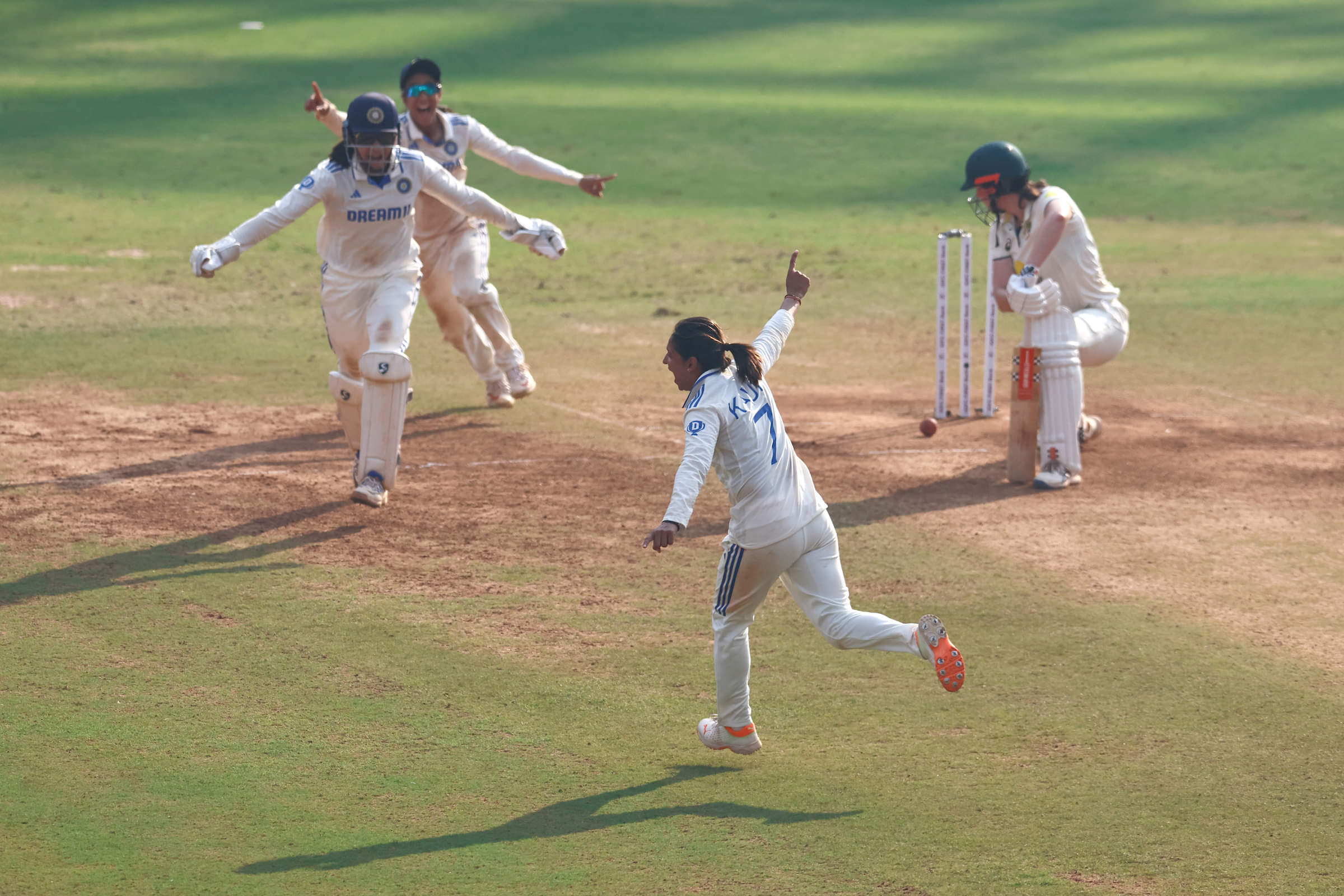 They batted for 65.4 overs and scored just 190 runs. When Harmanpreet Kaur finally broke their stand by cleaning up Luus, her loud roar dissipated all the frustration that the two batters had built in the Indian side. After their record first innings score, they would have thought that it would be easy for them. After all, if the Test regular Aussies couldn’t last, what could the Proteas women do, who hardly play the format?