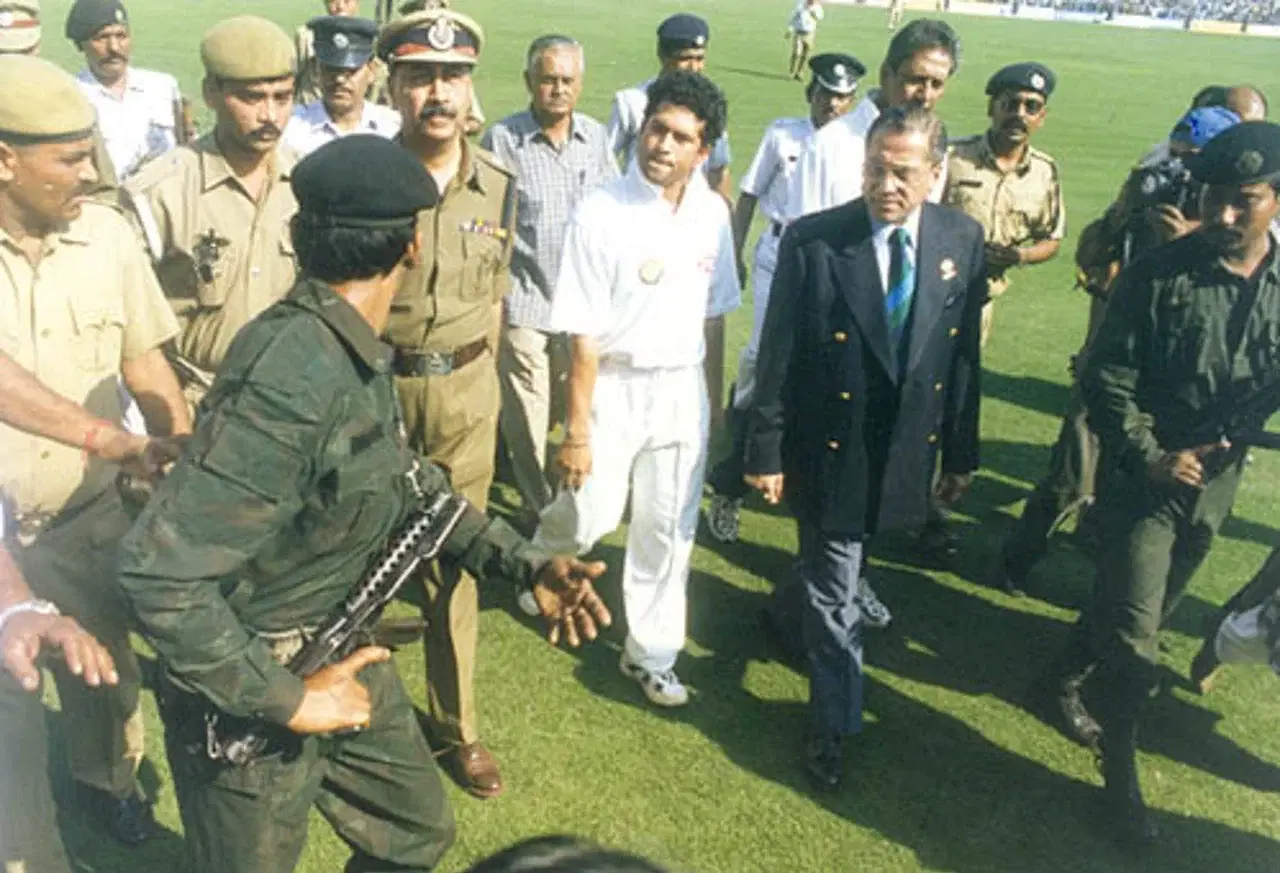 Wisden reported, "Spectators started burning newspapers in the stands and hurled stones, fruit, and plastic bottles onto the field. The match was held up for over three hours as about 65,000 people were removed by police and security men. The crowd's anger was still concentrated on Tendulkar's run-out, but there was little viciousness in the riot; it was born of disappointment rather than anti-Pakistan feelings. There was no sign of violence outside the ground."