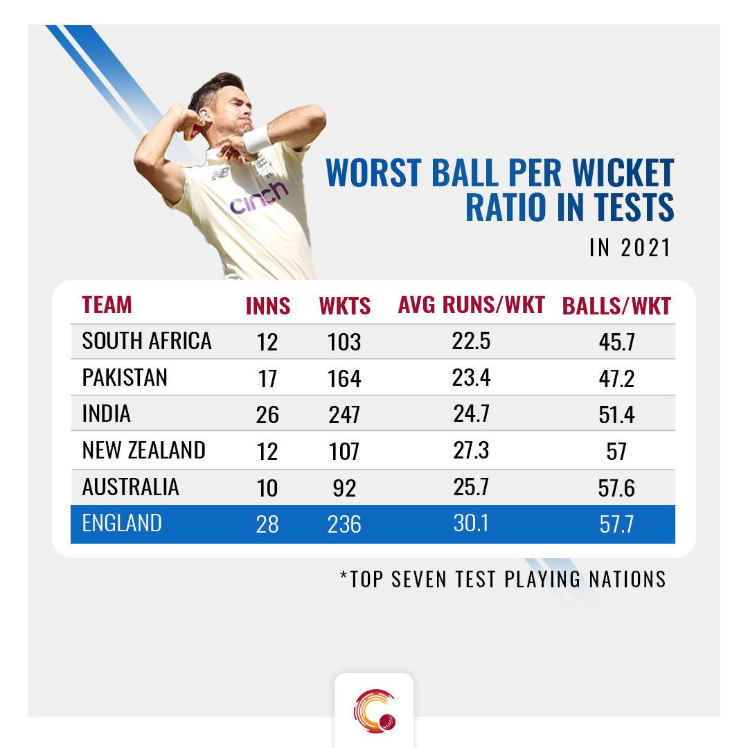 Amidst all the drama surrounding the batting unit, England have not been lethal with the ball either, as they managed to scalp 236 wickets in 28 innings at an average ball per wicket of 57.7, the lowest among the top seven Test playing nations.
