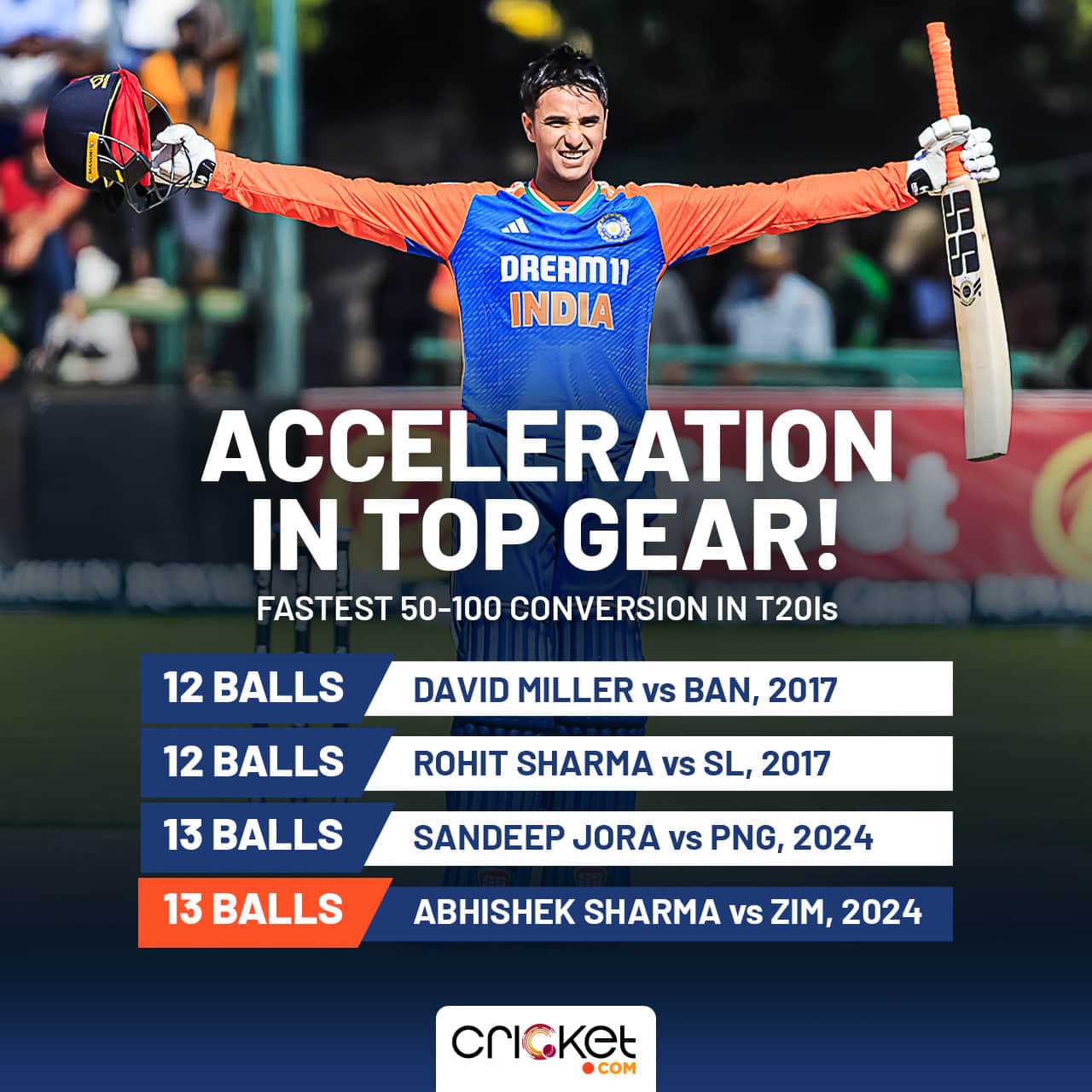 Abhishek shifted gears against Sikandar Raza, the Player of the Match yesterday with 3/25, whacking him for a four and a six. In the 11th, he hammered the medium pacer, Dion Myers for three fours and two sixes. The Punjab-born dashed from 50 to 100 in only 13 balls, the joint second-fastest in T20I history.