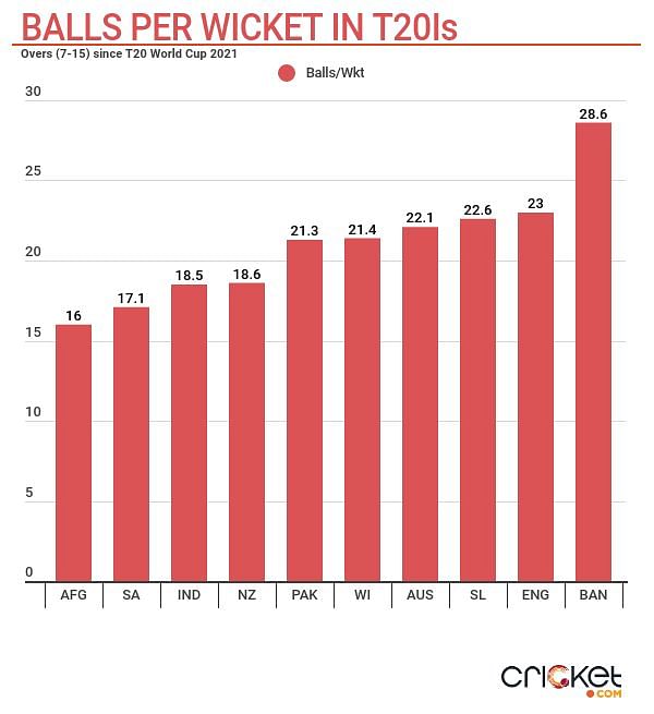 In the 15 innings played thus far after the T20 World Cup, Afghanistan have conceded at an economy rate of 6.9 runs per over in the middle overs (7-15) and picked up 46 wickets at balls per wicket ratio of 16, which is the best among the top ten teams.