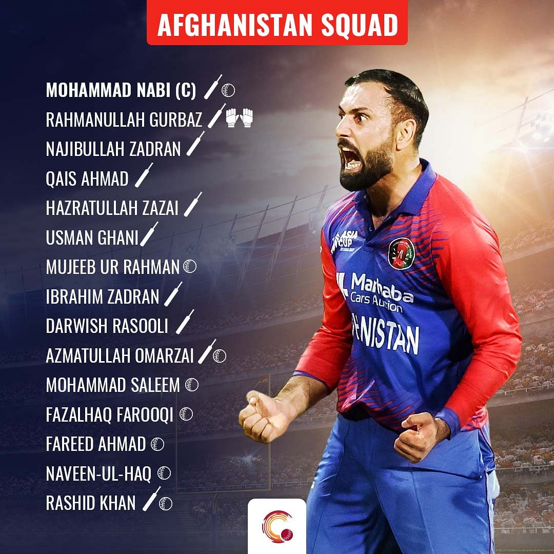 Probable XI: Hazratullah Zazai, Rahmanullah Gurbaz (wk), Ibrahim Zadran, Najibullah Zadran (vice-captain), Mohammad Nabi (Captain), Fareed Ahmad Malik, Rashid Khan, Azmatullah Omarzai, Mujeeb Ur Rahman, Naveen-ul-Haq, Fazalhaq Farooqi
