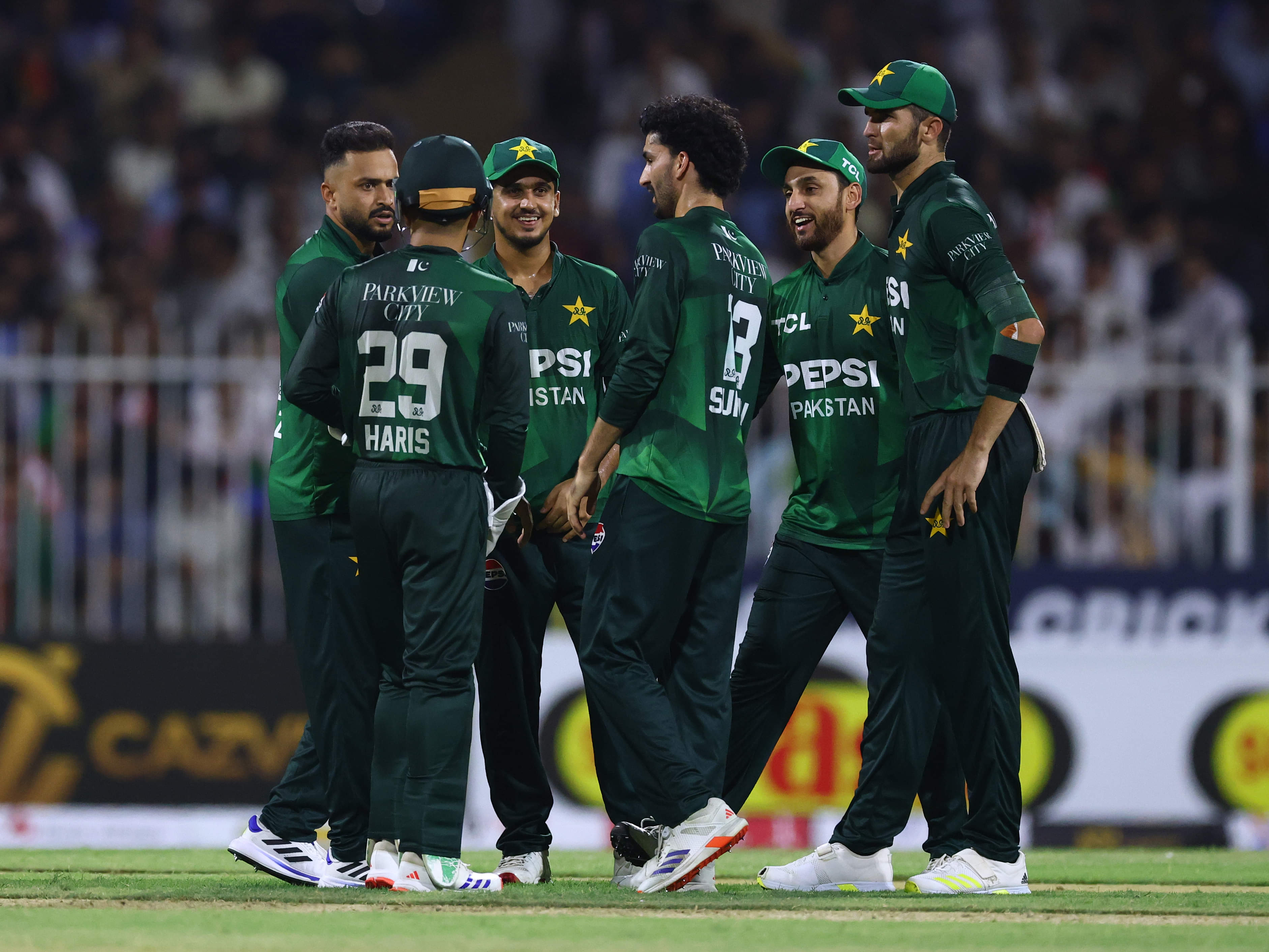 Saim Ayub, Sahibzada Farhan, Fakhar Zaman, Mohammad Haris (wk), Hasan Nawaz, Salman Agha (c), Mohammad Nawaz, Faheem Ashraf, Shaheen Shah Afridi, Sufiyan Muqeem, Haris Rauf