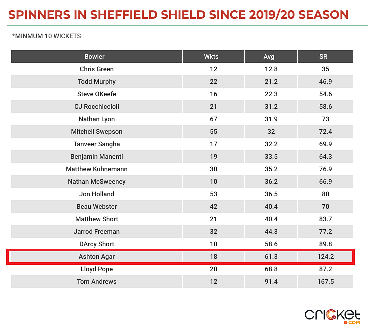 Agar has been a regular in the Australian white-ball set-up for a good part of five years, but back home, his inclusion in the red-ball scheme of things wasn’t a popular one. The reason being his rather grim record in the Shield where he’s not just struggled but has been among the worst spinners in the entire competition.