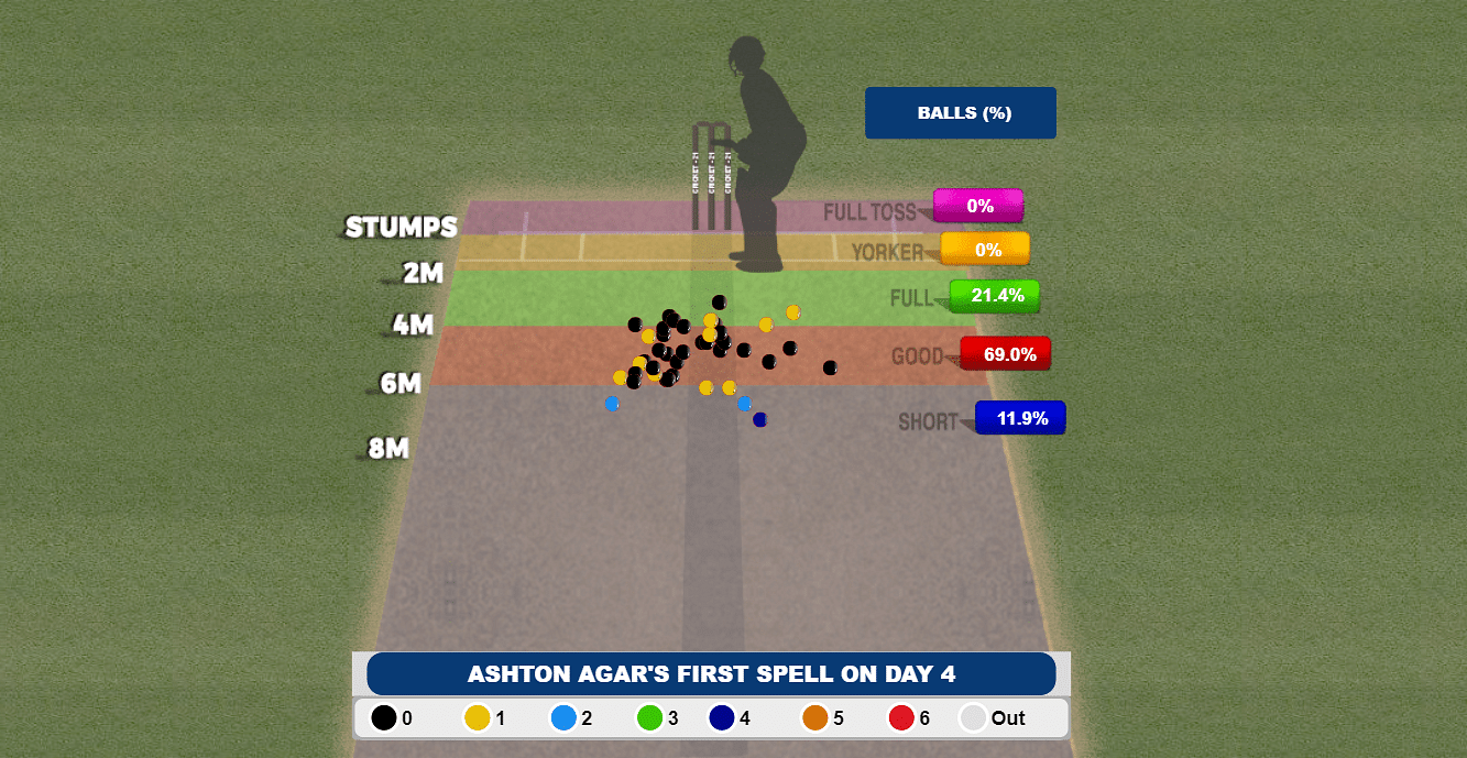 Agar bowled two more spells in the first innings and, overall, drew a shockingly low 3.5% false shots, by some distance the lowest among all Australian bowlers — Travis Head included.