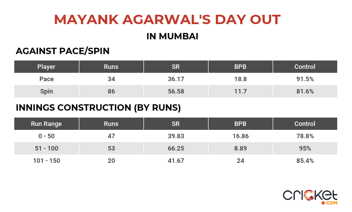 The Test match had its own share of ebbs and flows but Mayank’s batting brilliantly captured the essence of Mumbai Test – measured aggression. Even after facing over 200 deliveries, the right-hander had a control of 87%.
