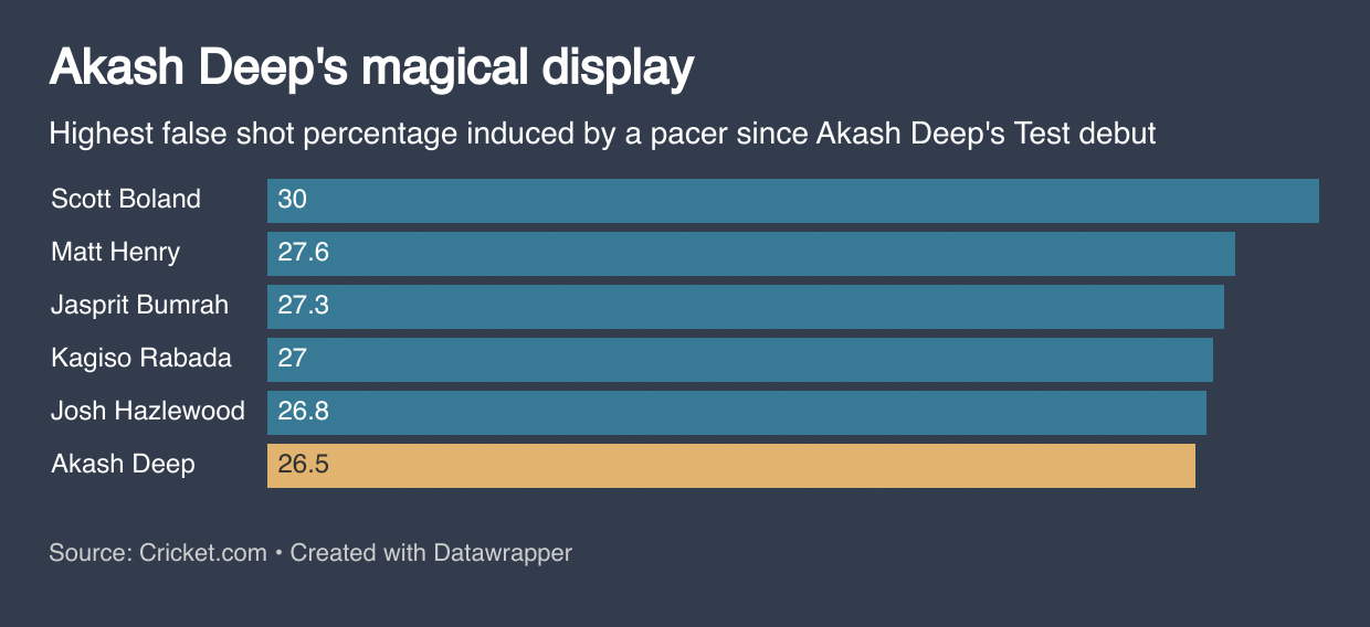 The 28-year-old has already induced 26.5% false shots in his Test career, the sixth-most for any pacer in the red-ball format since his debut. The four above him? Scott Boland, Matt Henry, Jasprit Bumrah, Kagiso Rabada and Josh Hazlewood - all elite, experienced red-ball pacers.