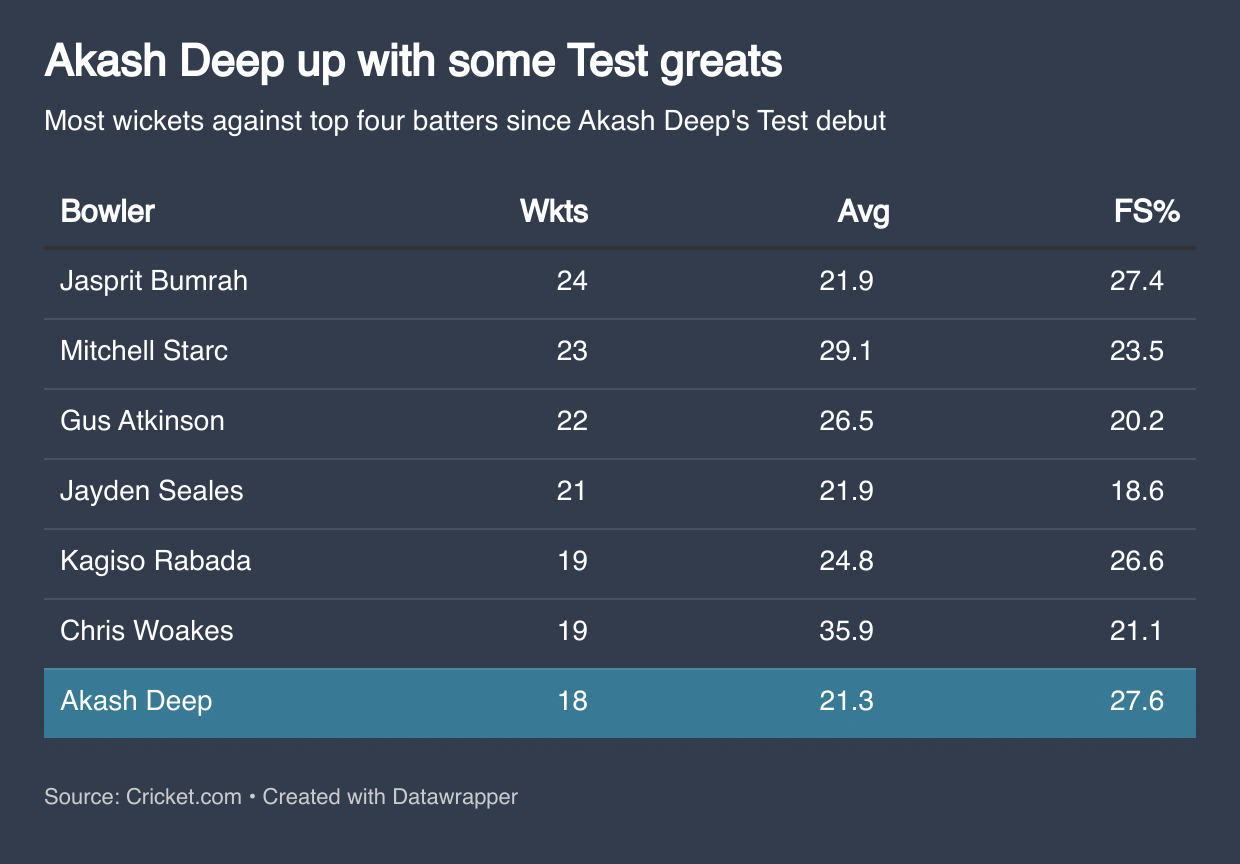 But for someone in his eighth Test, it is mighty impressive. Unlike Bumrah, there aren’t any idiosyncrasies around Akash Deep. He follows the most clichéd of all cricketing phrases - keep it simple, and by that, we mean - target the stumps.