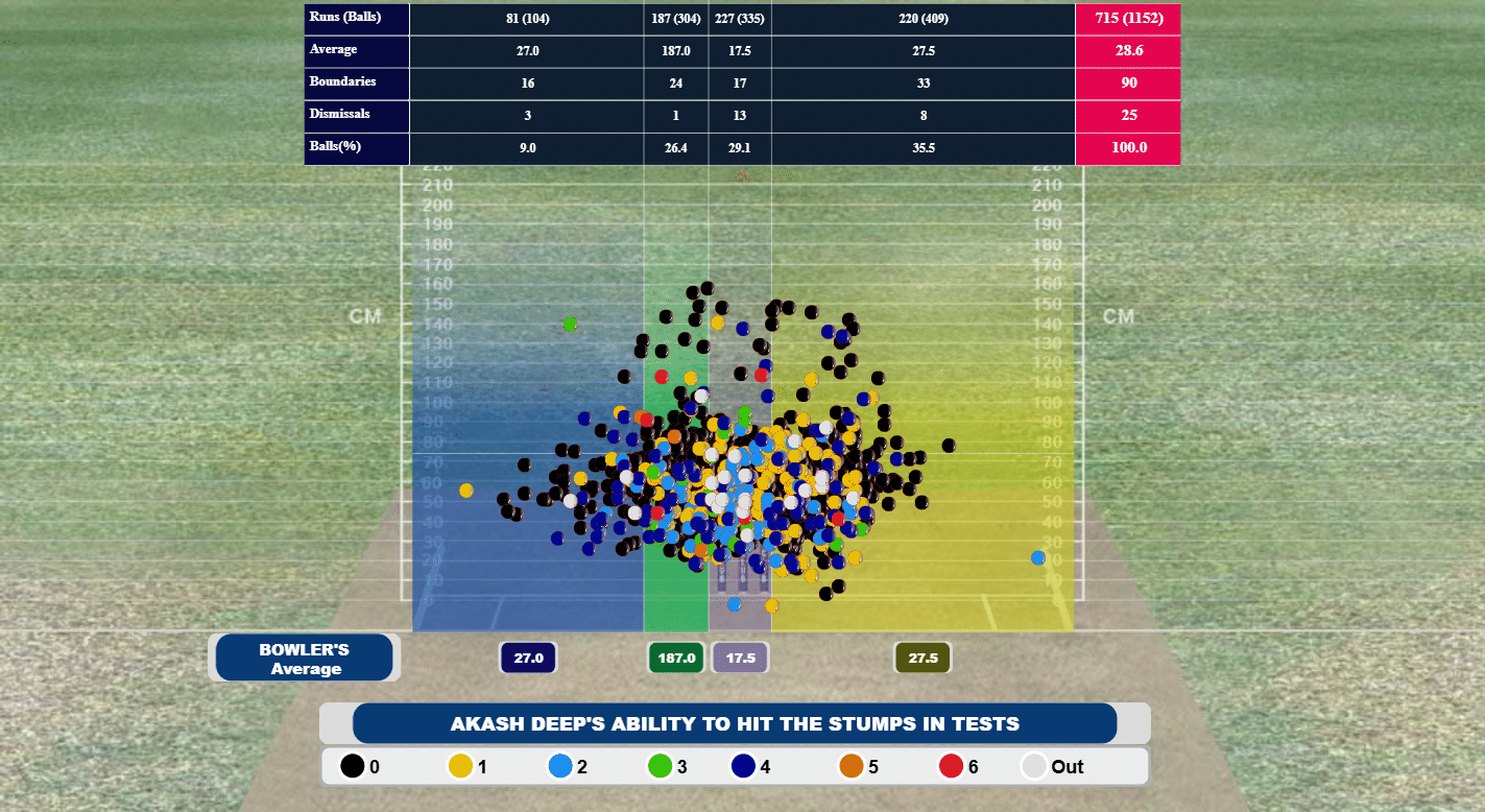Since 2024, only three bowlers (min 50 overs) have hit the stumps more than the Bihar-born (29.1%) - James Anderson (41.6%), Nathan Smith (33.1%) and Bumrah (30.6%). And possibly over Siraj as well, the leader for India in Bumrah’s absence, even when it is the easiest thing to do for a bowler.