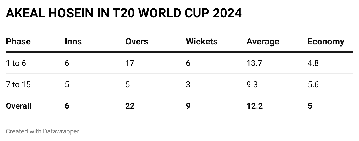The southpaw has primarily made an impact in the powerplay, where he has bowled 17 of his 22 overs. He has consistently bowled three overs in the powerplay, starting the bowling for West Indies. Outside the powerplay, Hosein has bowled five overs in six matches, only used in one-over spells.