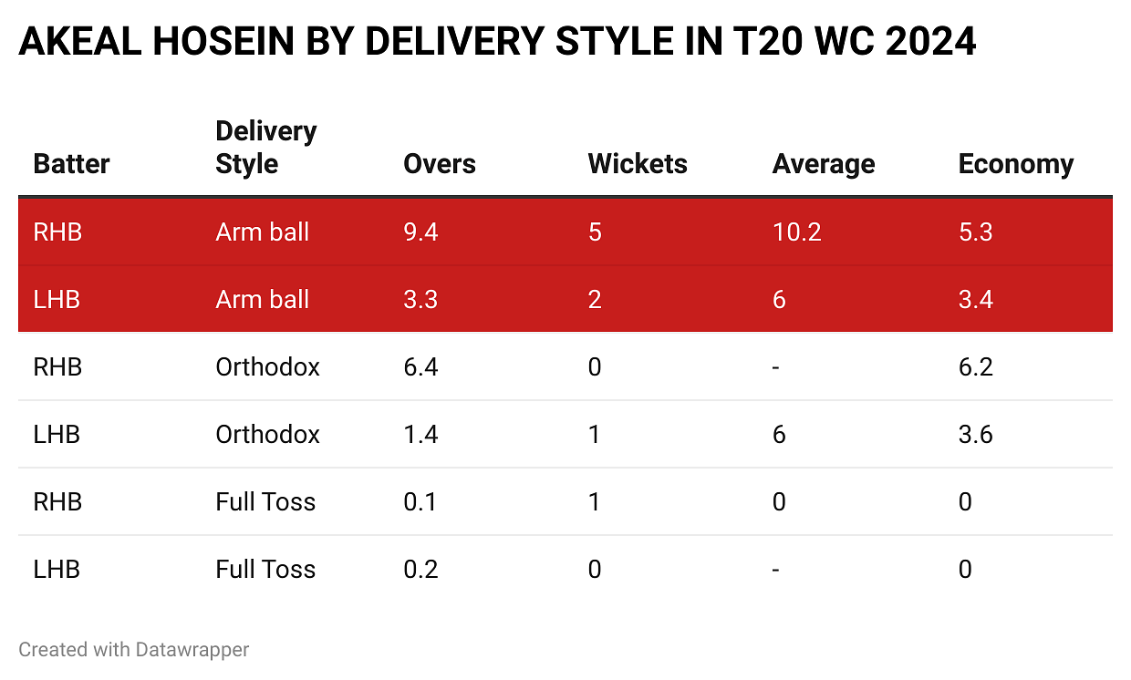 While orthodox left-arm spin has been his secondary option for Hosein, the arm ball has been the primary choice, accounting for five of his six powerplay wickets. In fact, Hosein darts his arm balls into the right-hander by a big margin, almost like a hooping in-swinger. This way, he moves the ball in both directions. Imad Wasim, another specialist powerplay spinner, is the only other left-arm spinner who does that.