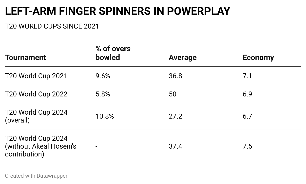 The numbers for slow left-arm spinners in powerplay this World Cup are par with the 2021 edition. However, Hosein has created a big difference.